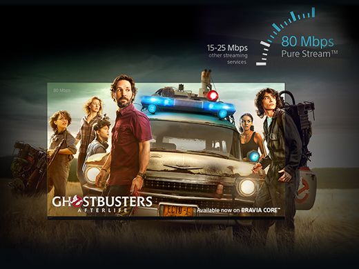 3Based on research from December 2020. User must setup broadband network environment. By default, Pure Stream setting is turned OFF and must be turned ON in BRAVIA CORE settings. BRAVIA CORE offers streaming between 30Mbps-80Mbps once user turns ON Pure Stream. To access Pure Stream at 30Mbps, user must have a minimum internet speed of 43Mbps over Wi-Fi. To access highest quality Pure Stream available at 80Mbps user must have minimum internet speed of 115Mbps over Wi-Fi. Subject to user’s network operator’s video streaming restrictions, BRAVIA CORE automatically selects the best bitrate as following with adaptive streaming functionality based on the internet speed available.
